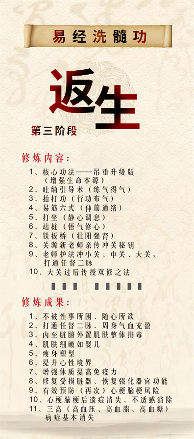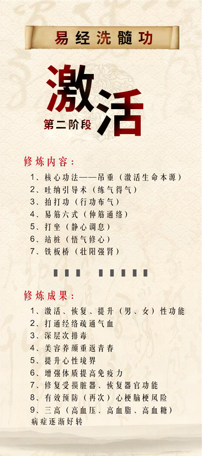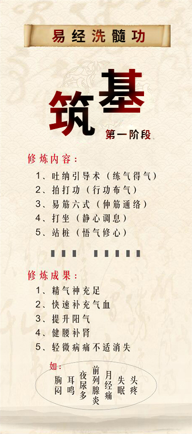 易筋洗髓功核心是通过“开筋点穴、秘法吐纳、根部垂吊、经络拍打、易筋拉伸、打坐禅定” 6个步骤的习练,从人体生理之根入手,借助重物垂吊的方式,通过外肾运动激活人体肾能量,肾气足,精血旺!达到祛病防病、修身延命、强身壮体、延缓衰老的目的!特别针对男性**减退、阳痿早泄、射精无力、**稀薄、精子质量差、前列腺疾病;女士未老先衰、脸色晦暗、皱纹长斑、妇科病等;老人常见的三高、心脑血管、糖尿病、腰膝腿疼等,效果神奇无比!